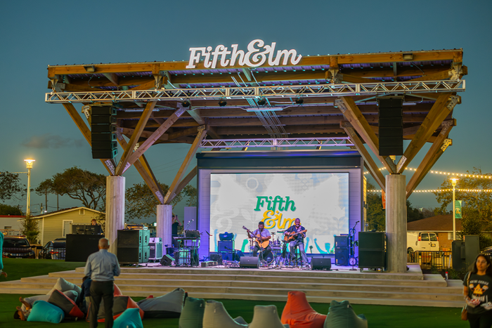 Take your time getting ready for dinner. Texas A1 Steaks & Seafood is a local favorite: Nueces Bay flounder battered in pecan flour, golden fried catfish, and steaks cooked exactly right. Or, if you're in the mood for something with a little more scene, head to The Grove inside Fifth & Elm. Gulf Coast Oysters, coastal fish tacos, craft cocktails like the Harbor Breeze and the Old Town Sangria. It's the kind of dinner that turns into an evening. After dinner, check the Fifth & Elm calendar. There's something happening most Saturday evenings, from live music to tribute performances like Queen!